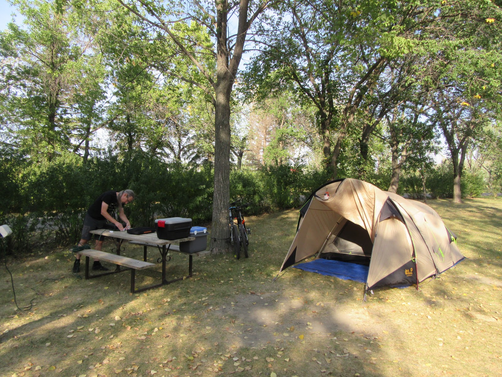 Puis nous arrivons à Weyburn, petite ville de la Saskatchewan. Nous faisons halte pour la nuit au camping municipal. Il n'y a personne à l'accueil à notre arrivée. Apparemment nous n'avons qu'à choisir notre emplacement, nous y installer et payer lorsqu'il y aura quelqu'un. Après un peu d'hésitation sur l'emplacement, nous plantons la tente, poursuivons nos mises à jour et profitons du beau temps !